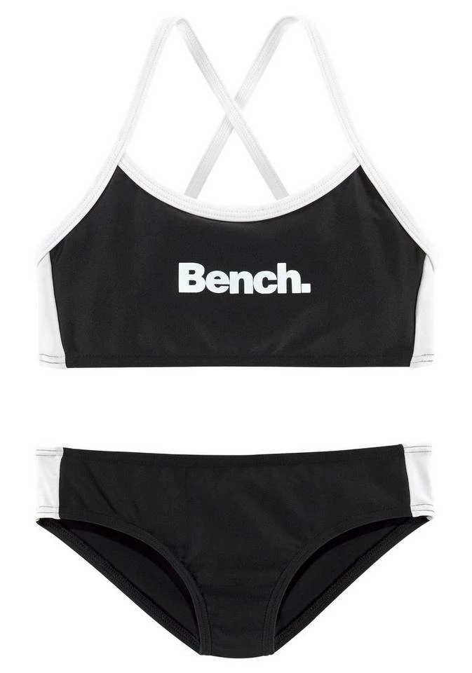 Der moderne Bustierbikini von Bench besticht durch gekreuzte und regulierbare Träger im Rücken. Des Weiteren befindet sich auf dem Bikinitop mit kontrastreichen Trägern ein plakativer Logoprint. Das schicke Höschen kommt ganz klassisch und mit kontrastfarbenen Seitenstreifen daher. Dank der trageangenehmen Materialmischung sorgen Ober- und Unterteil gemeinsam für einen famosen Sitz. Der trendige Bikini begeistert nicht nur am Strand, sondern auch in der Therme. Unverzichtbar gut: der Bustierbikini von Bench! Obermaterial: 80% Polyamid, 20% Elasthan (Xtra Life LYCRA®). Futter: 100% Polyester.