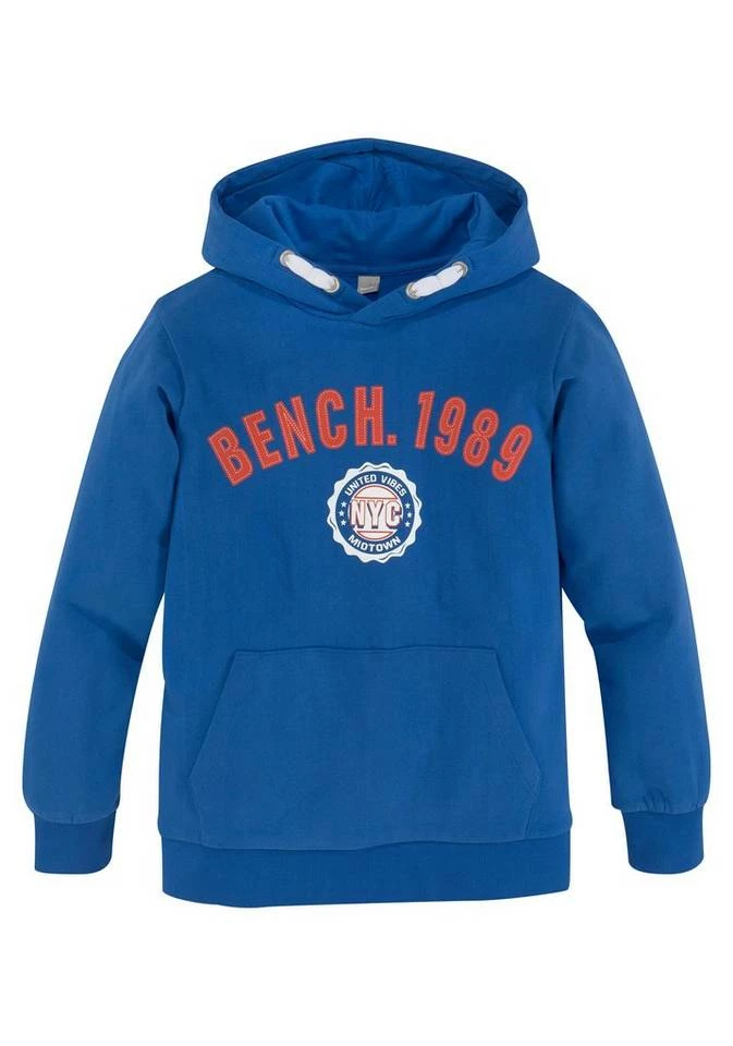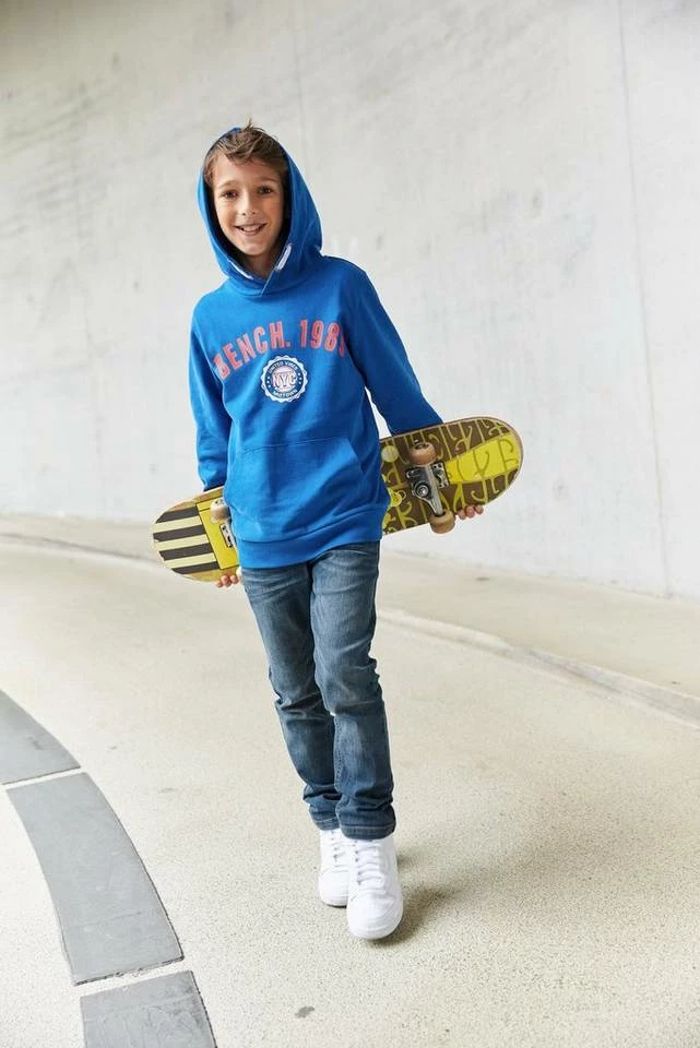 Ob Mode-Blogger oder nicht — dieses Kapuzensweatshirt der Marke Bench. finden alle Jungs stylisch. Es wirkt mit dem Aufdruck stylisch und cool. Die Ärmel enden in einem Rippbündchen. Es ist basic geschnitten, sodass sich Teenies frei bewegen können. Die vorne am Bauch aufgenähte Kängurutasche macht den bequemen Hoodie-Look komplett.