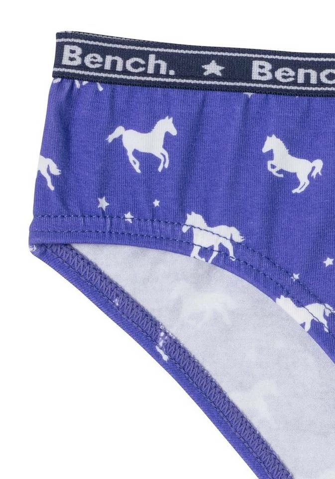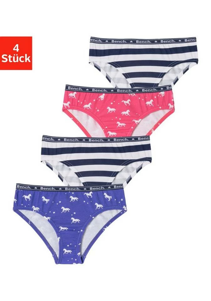 Da ist was für jede Lust und Laune dabei! Der 4er-Pack Slips von Bench bietet mit zwei Exemplaren mit Pferde- und zwei mit Streifenprint reichlich Abwechslung. Eines aber haben alle vier Mädchenslips gemeinsam: den weichen Webbund mit umlaufenden Bench-Schriftzug, der durch die integrierten Sternchen ein perfektes Finish erhält. Vom Branding lässt sich hier übrigens auch auf die Qualität schließen. Denn die elastische Baumwolle ist ein Garant für hohen Komfort und verspricht eine perfekte Passform. Vier Exemplare zum puren Wohlfühlen: Das ist der 4er-Pack Slips aus dem Hause Bench!